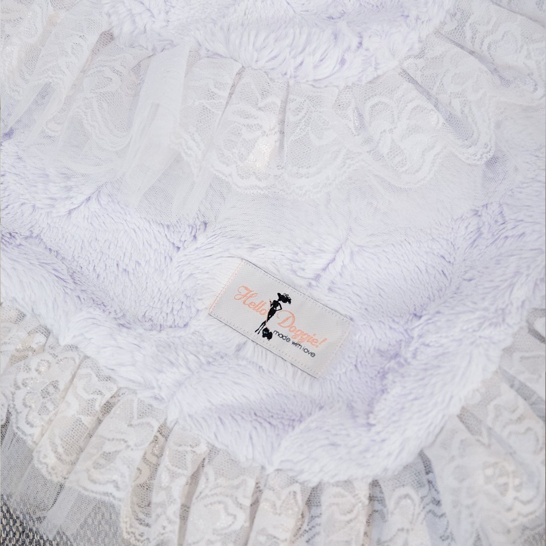 This beautiful soft blanket by Hello Doggie is made of high quality soft fabric and features a double layer of 2 tiered romantic lace. It’s so soft your pup won’t leave it. The lace gives the blanket an elegant touch, perfect for home decor. This blanket is easy to care for, spot clean or hand wash and air dry. Add an additional 2" for the satin ruffle for large blanket and add additional 1" for the small. Small Blanket - *17" x 14"     |     For dogs up to 4 Lbs MSRP - $108.00   Large Blanket - *34” x 29"     |    For dogs up to 20 Lbs MSRP - $149.99 Throw Blanket - *58” x 58"     |    For dogs up to 100 Lbs MSRP - $459.99   *Blanket is handmade and sizes may vary slightly. Made in USA.