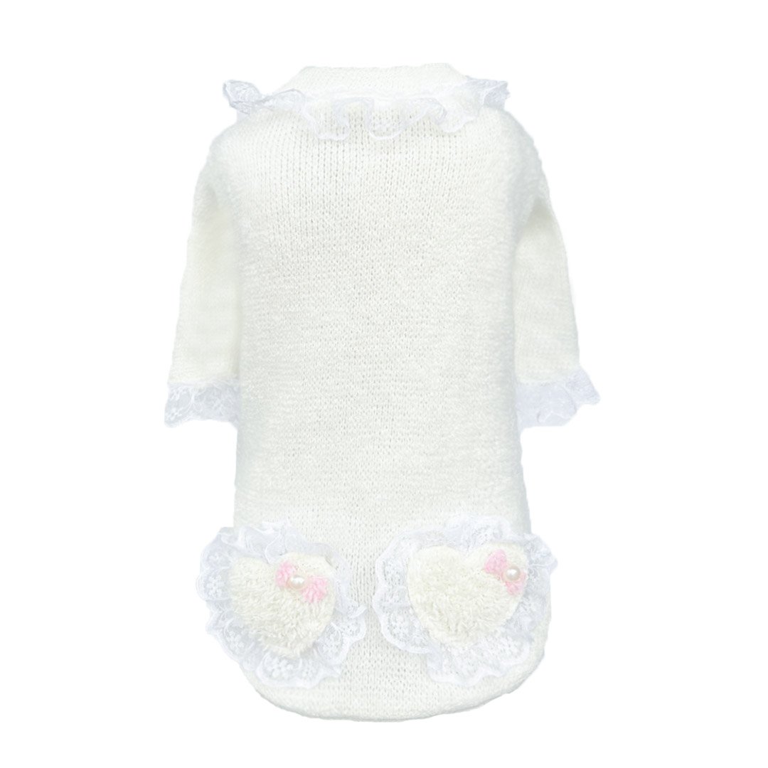 Introducing the charming Lil Lamb Dog Sweater by Hello Doggie! This exquisite piece is designed with premium cotton knit fabric and adorned with a touch of elegance. The handcrafted accessories include romantic lace details, sheer bows accented with delicate pearls, and heart-shaped pockets, all adding a touch of sophistication to this cozy sweater. Crafted with meticulous attention to detail, this sweater is not just comfortable for your furry friend, but also a stylish statement piece for any occasion. For the perfect winter outfit pair with one of our coats. Spot Clean or wash on delicate, no bleach or softener and air dry.  Sizes  |  SM – LG  MSRP  |  $48.00  *Sweaters are handmade and sizes may vary slightly. Made in USA.